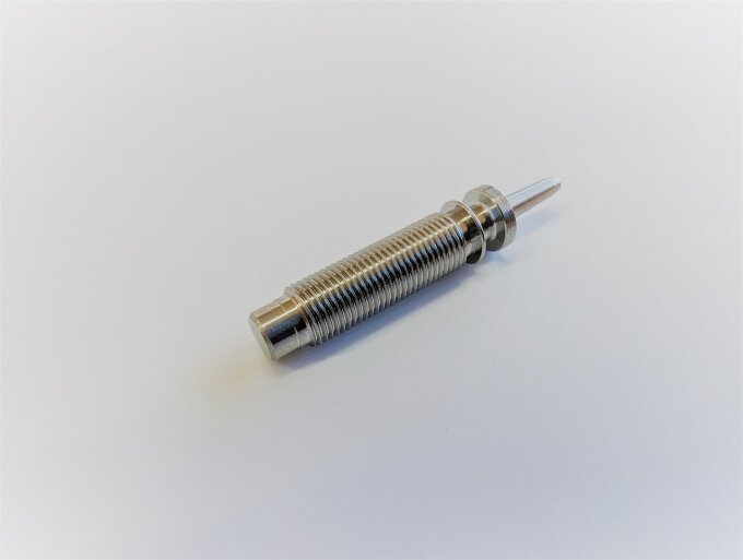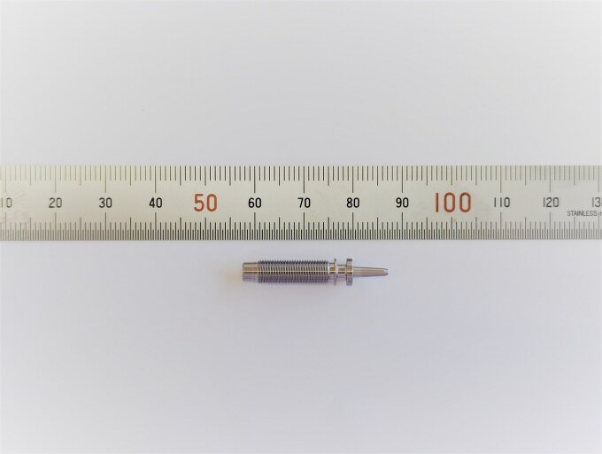 【ネジ精度】ステンレス空圧機器部品 材質:ステンレス 種類:ステンレス空圧機器部品 ステンレス製の空圧機器コネクタ部品です。バー材料からNC自動盤により切削加工を行っています。 生産数は1ロット2万個の量産切削加工品です。 FAロボット装置向けの空圧機器のため、加工部高い精度が必要です。 切削時にバリが出やすいステンレス材料、かつネジ加工部ですが、バリを抑えるために加工時のプログラム作成から工夫し、品質不良を抑える取り組みを続けています。